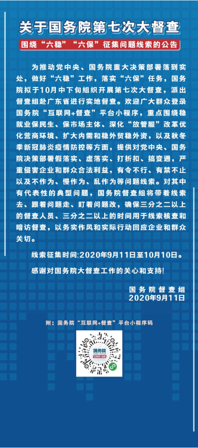 關(guān)于國務(wù)院第七次大督查圍繞“六穩(wěn)”“六?!闭骷瘑栴}線索的公告