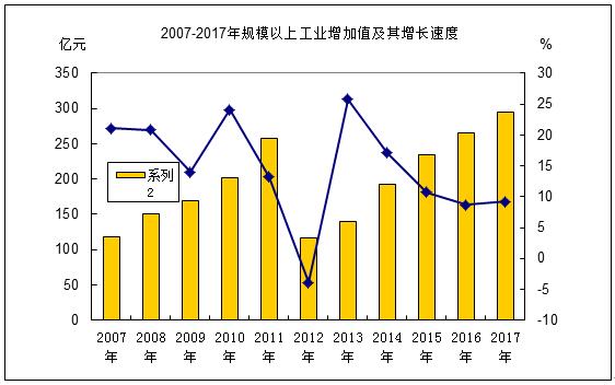 2017年,全區(qū)實現(xiàn)規(guī)模以上工業(yè)增加值294.62億元,同比增長9.2%,其中,輕工業(yè)增加值175.13億元,同比增長14.9%;重工業(yè)增加值119.49億元,同比增長4.3%。