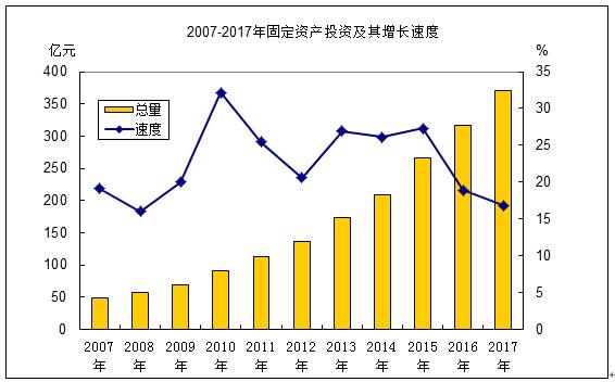 2017年,全區(qū)固定資產(chǎn)投資 370.4億元,同比增長16.8%。分產(chǎn)業(yè)看,第二產(chǎn)業(yè)投資101.84億元,同比增長15.15%;第三產(chǎn)業(yè)投資268.58億元,同比增長17.48%。