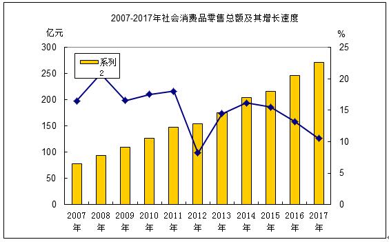 2017年,全區(qū)社會消費品零售總額271.97億元,同比增長10.5%。分行業(yè)看,批發(fā)零售業(yè)零售額259.6億元,同比增長11.12%;住宿和餐飲業(yè)零售額12.37億元,同比下降1.13%。