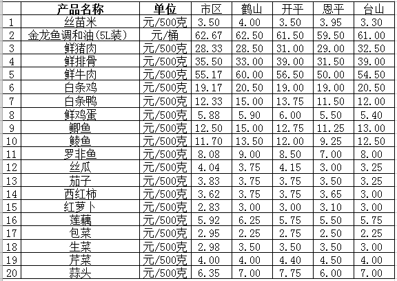 說明:1、表中價格為該地區(qū)監(jiān)測點綜合平均價;2、“市區(qū)”含蓬江區(qū)、江海區(qū)、新會區(qū),價格分別采自蓬江市場、江南市場、城東市場等6家農貿市場;3、其他四個縣市價格分別采自新鶴市場、錦江市場等8家農貿市場。