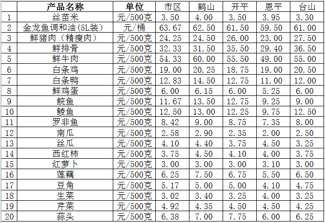 說明:1、表中價(jià)格為該地區(qū)監(jiān)測點(diǎn)綜合平均價(jià);2、“市區(qū)”含蓬江區(qū)、江海區(qū)、新會(huì)區(qū),價(jià)格分別采自蓬江市場、江南市場、城東市場等6家農(nóng)貿(mào)市場;3、其他四個(gè)縣市價(jià)格分別采自新鶴市場、錦江市場等8家農(nóng)貿(mào)市場。