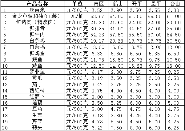 說(shuō)明:1、表中價(jià)格為該地區(qū)監(jiān)測(cè)點(diǎn)綜合平均價(jià);2、“市區(qū)”含蓬江區(qū)、江海區(qū)、新會(huì)區(qū),價(jià)格分別采自蓬江市場(chǎng)、江南市場(chǎng)、城東市場(chǎng)等6家農(nóng)貿(mào)市場(chǎng);3、其他四個(gè)縣市價(jià)格分別采自新鶴市場(chǎng)、錦江市場(chǎng)等8家農(nóng)貿(mào)市場(chǎng)。