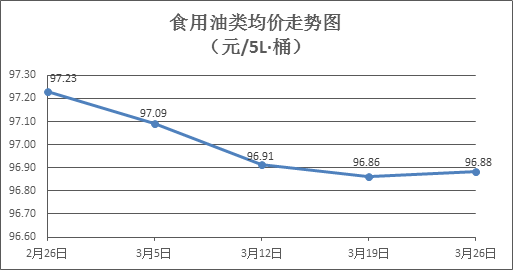 食用油類商品價格微幅波動。本周所監(jiān)測的9種食用油(5L裝)商品價格波動情況為1升6降2平,綜合零售均價為96.88元/桶,環(huán)比上漲0.02%。其中:胡姬花花生油、大豆油零售均價分別為每桶145.83元、61.53元,環(huán)比分別上漲0.57%、下降0.18%。