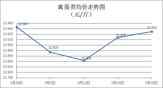 禽蛋類商品價格總體略升。本周所監(jiān)測的6種禽蛋類商品價格波動情況為4漲2跌,綜合零售均價為10.950元/斤,環(huán)比上漲0.20%。其中:白條雞、白條鴨零售均價分別為每斤19.74元、15.37元,環(huán)比分別上漲0.10%、上漲0.65%;白殼雞蛋、鴨蛋零售均價分別為每斤6.91元、7.85元,環(huán)比分別下降0.29%、上漲0.13%。