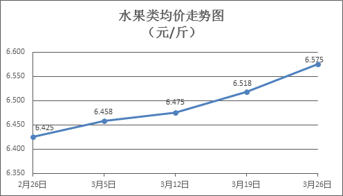 水果類商品價格升降互現(xiàn)。本周所監(jiān)測的6種水果商品價格波動情況為3漲3跌,綜合零售均價為6.575元/斤,環(huán)比上漲0.87%。其中蘋果、香蕉、葡萄零售均價分別為每斤7.13元、3.16元、13.00元,環(huán)比分別下降0.28%、上漲0.64%、上漲1.40%。