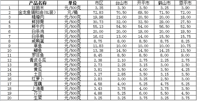 說明:1、表中價格為該地區(qū)監(jiān)測點綜合平均價;2、“市區(qū)”含蓬江區(qū)、江海區(qū)、新會區(qū),價格分別采自蓬江市場、江南市場、城東市場等13家農貿市場;3、其他四個縣市價格分別采自新華市場、錦江市場等8家農貿市場。