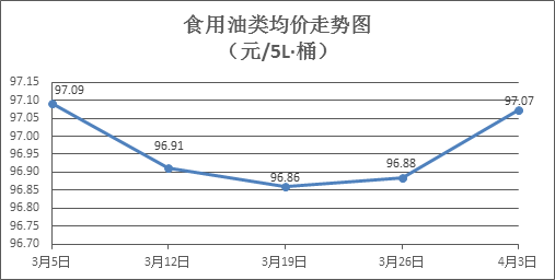 食用油類商品價格總體微升。本周所監(jiān)測的9種食用油(5L裝)商品價格浮動情況為5漲3跌1平,綜合零售均價為97.07元/桶,環(huán)比上漲0.19%。其中:胡姬花花生油、大豆油零售均價分別為每桶147.50元、61.39元,環(huán)比分別上漲1.15%、下降0.23%。