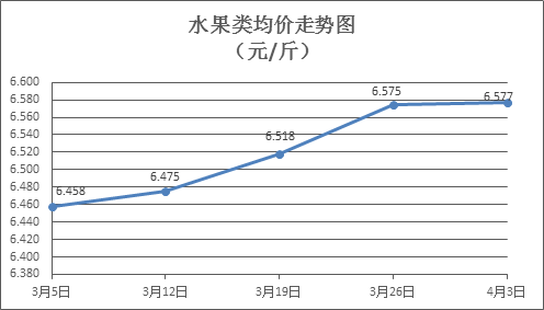 水果類商品價格窄幅盤整。本周所監(jiān)測的6種水果商品價格波動情況為3漲2跌1平,綜合零售均價為6.577元/斤,環(huán)比上漲0.03%。其中蘋果、香蕉、橙子零售均價分別為每斤7.14元、3.18元、6.46元,環(huán)比分別上漲0.14%、上漲0.63%、下降0.46%。