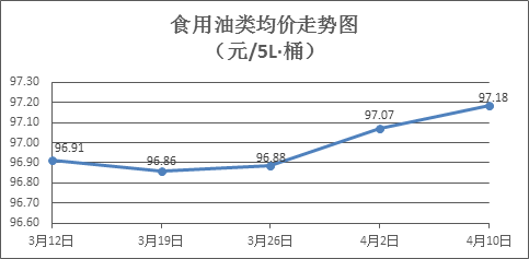 食用油類商品價(jià)格總體微升。本周所監(jiān)測(cè)的9種食用油(5L裝)商品價(jià)格浮動(dòng)情況為5漲3跌1平,綜合零售均價(jià)為97.18元/桶,環(huán)比上漲0.12%。其中:金龍魚花生油、金龍魚調(diào)和油零售均價(jià)分別為每桶105.44元、71.71元,環(huán)比分別上漲0.34%、上漲0.03%。