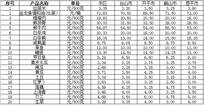 說明:1、表中價(jià)格為該地區(qū)監(jiān)測(cè)點(diǎn)綜合平均價(jià);2、“市區(qū)”含蓬江區(qū)、江海區(qū)、新會(huì)區(qū),價(jià)格分別采自蓬江市場(chǎng)、江南市場(chǎng)、城東市場(chǎng)等13家農(nóng)貿(mào)市場(chǎng);3、其他四個(gè)縣市價(jià)格分別采自新華市場(chǎng)、錦江市場(chǎng)等8家農(nóng)貿(mào)市場(chǎng)。