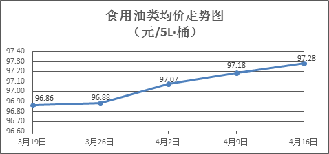 食用油類商品價(jià)格總體微升。本周所監(jiān)測的9種食用油(5L裝)商品價(jià)格波動情況為7漲1跌1平,綜合零售均價(jià)為97.28元/桶,環(huán)比上漲0.10%。其中:金龍魚花生油、金龍魚調(diào)和油零售均價(jià)分別為每桶105.74元、71.83元,環(huán)比分別上漲0.28%、上漲0.17%。
