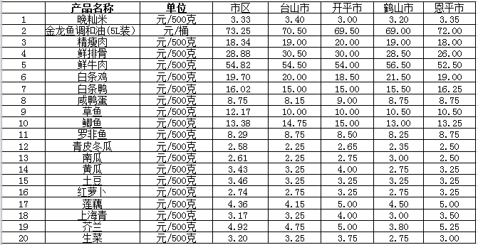 說明:1、表中價格為該地區(qū)監(jiān)測點綜合平均價;2、“市區(qū)”含蓬江區(qū)、江海區(qū)、新會區(qū),價格分別采自蓬江市場、江南市場、城東市場等13家農(nóng)貿(mào)市場;3、其他四個縣市價格分別采自新華市場、錦江市場等8家農(nóng)貿(mào)市場。