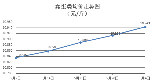 禽蛋類(lèi)商品價(jià)格窄幅盤(pán)升。上周所監(jiān)測(cè)的6種禽蛋類(lèi)商品價(jià)格波動(dòng)情況為4漲2跌,綜合零售均價(jià)為10.943元/斤,環(huán)比上漲0.27%。其中:白條雞、白條鴨零售均價(jià)分別為每斤19.73元、15.63元,環(huán)比分別上漲0.20%、下降0.64%;白殼雞蛋、鴨蛋零售均價(jià)分別為每斤6.73元、7.93元,環(huán)比分別上漲1.05%、上漲0.38%。