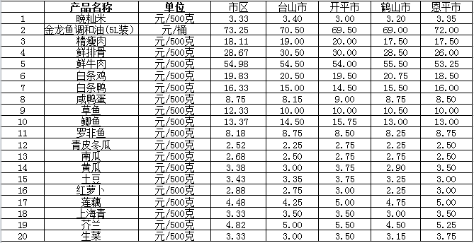 說(shuō)明:1、表中價(jià)格為該地區(qū)監(jiān)測(cè)點(diǎn)綜合平均價(jià);2、“市區(qū)”含蓬江區(qū)、江海區(qū)、新會(huì)區(qū),價(jià)格分別采自蓬江市場(chǎng)、江南市場(chǎng)、城東市場(chǎng)等13家農(nóng)貿(mào)市場(chǎng);3、其他四個(gè)縣市價(jià)格分別采自新華市場(chǎng)、錦江市場(chǎng)等8家農(nóng)貿(mào)市場(chǎng)。