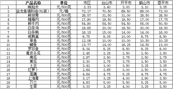 說(shuō)明:1、表中價(jià)格為該地區(qū)監(jiān)測(cè)點(diǎn)綜合平均價(jià);2、“市區(qū)”含蓬江區(qū)、江海區(qū)、新會(huì)區(qū),價(jià)格分別采自蓬江市場(chǎng)、江南市場(chǎng)、城東市場(chǎng)等13家農(nóng)貿(mào)市場(chǎng);3、其他四個(gè)縣市價(jià)格分別采自新華市場(chǎng)、錦江市場(chǎng)等8家農(nóng)貿(mào)市場(chǎng)。