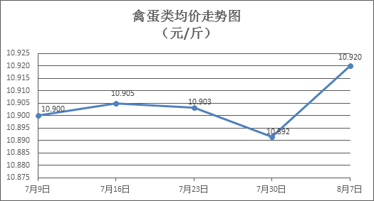 禽蛋類(lèi)商品價(jià)格略有上漲。上周所監(jiān)測(cè)的6種禽蛋類(lèi)商品價(jià)格波動(dòng)情況為4漲2跌,綜合零售均價(jià)為10.920元/斤,環(huán)比上漲0.26%。其中:白條雞、白條鴨零售均價(jià)分別為每斤19.76元、15.38元,環(huán)比分別上漲0.46%、下降0.13%;白殼雞蛋、鴨蛋零售均價(jià)分別為每斤6.68元、7.97元,環(huán)比分別上漲0.91%、上漲0.50%。