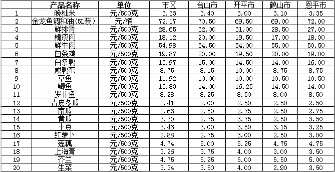 說(shuō)明:1、表中價(jià)格為該地區(qū)監(jiān)測(cè)點(diǎn)綜合平均價(jià);2、“市區(qū)”含蓬江區(qū)、江海區(qū)、新會(huì)區(qū),價(jià)格分別采自蓬江市場(chǎng)、江南市場(chǎng)、城東市場(chǎng)等13家農(nóng)貿(mào)市場(chǎng);3、其他四個(gè)縣市價(jià)格分別采自新華市場(chǎng)、錦江市場(chǎng)等8家農(nóng)貿(mào)市場(chǎng)。