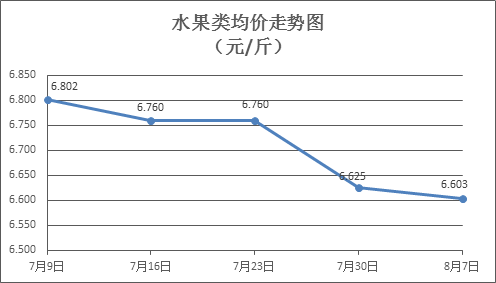 水果類(lèi)商品價(jià)格微幅下降。上周所監(jiān)測(cè)的6種水果商品價(jià)格波動(dòng)情況為2漲4跌,綜合零售均價(jià)為6.603元/斤,下降0.33%。其中橙子、蘋(píng)果、梨零售均價(jià)分別為每斤6.26元、7.43元、6.66元,環(huán)比分別上漲0.16%、下降0.13%、下降0.15%。