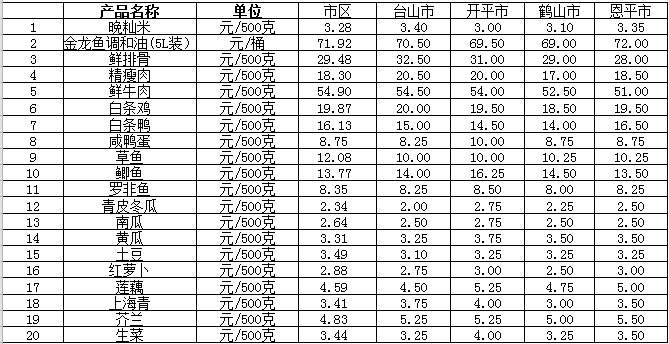 說明:1、表中價格為該地區(qū)監(jiān)測點綜合平均價;2、“市區(qū)”含蓬江區(qū)、江海區(qū)、新會區(qū),價格分別采自蓬江市場、江南市場、城東市場等13家農(nóng)貿(mào)市場;3、其他四個縣市價格分別采自新華市場、錦江市場等8家農(nóng)貿(mào)市場。