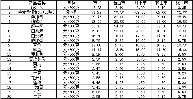 說明:1、表中價格為該地區(qū)監(jiān)測點綜合平均價;2、“市區(qū)”含蓬江區(qū)、江海區(qū)、新會區(qū),價格分別采自蓬江市場、江南市場、城東市場等13家農貿市場;3、其他四個縣市價格分別采自新華市場、錦江市場等8家農貿市場。