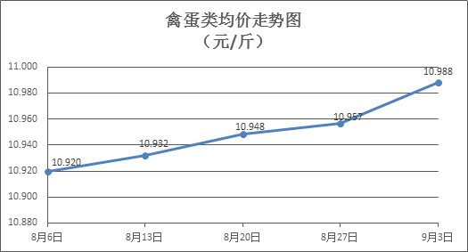 禽蛋類商品價(jià)格總體略漲。上周所監(jiān)測(cè)的6種禽蛋類商品價(jià)格波動(dòng)情況為4漲1跌1平,綜合零售均價(jià)為10.988元/斤,環(huán)比上漲0.29%。其中:白條雞、白條鴨零售均價(jià)分別為每斤19.62元、15.68元,環(huán)比分別上漲0.62%、上漲0.26%;白殼雞蛋、鴨蛋零售均價(jià)分別為每斤6.77元、7.93元,環(huán)比分別上漲0.45%、持平。