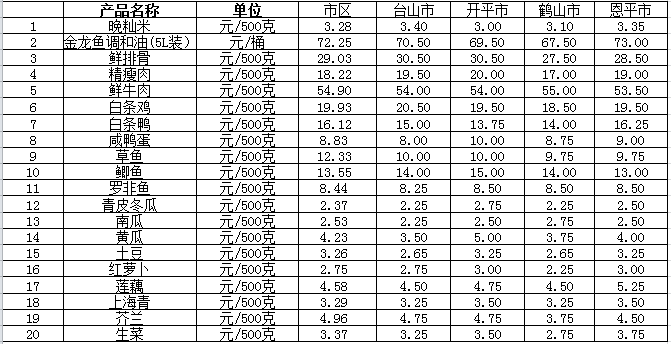 說明:1、表中價格為該地區(qū)監(jiān)測點綜合平均價;2、“市區(qū)”含蓬江區(qū)、江海區(qū)、新會區(qū),價格分別采自蓬江市場、江南市場、城東市場等13家農(nóng)貿(mào)市場;3、其他四個縣市價格分別采自新華市場、錦江市場等8家農(nóng)貿(mào)市場。