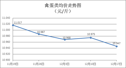 禽蛋類商品價格略有下降。上周所監(jiān)測的6種禽蛋類商品價格波動情況為1漲4跌1平,綜合零售均價為10.947元/斤,環(huán)比下降0.26%。其中:白條雞、白條鴨零售均價分別為每斤19.59元、15.37元,環(huán)比分別下降0.41%、上漲0.07%;白殼雞蛋、鴨蛋零售均價分別為每斤6.78元、8.04元,環(huán)比分別下降0.29%、下降0.25%。