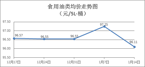 食用油類商品價(jià)格總體略降。上周所監(jiān)測的9種食用油(5L裝)商品價(jià)格波動(dòng)情況為4漲3跌2平,綜合零售均價(jià)為96.11元/桶,環(huán)比下降1.17%。其中:魯花花生油、金龍魚調(diào)和油零售均價(jià)分別為每桶155.37元、70.94元,環(huán)比分別下降0.68%、上漲0.08%。