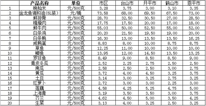 說明:1、表中價格為該地區(qū)監(jiān)測點綜合平均價;2、“市區(qū)”含蓬江區(qū)、江海區(qū)、新會區(qū),價格分別采自蓬江市場、江南市場、城東市場等13家農貿市場;3、其他四個縣市價格分別采自新華市場、錦江市場等8家農貿市場。