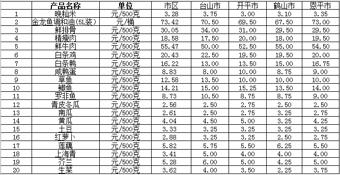 說明:1、表中價格為該地區(qū)監(jiān)測點綜合平均價;2、“市區(qū)”含蓬江區(qū)、江海區(qū)、新會區(qū),價格分別采自蓬江市場、江南市場、城東市場等13家農(nóng)貿(mào)市場;3、其他四個縣市價格分別采自新華市場、錦江市場等8家農(nóng)貿(mào)市場。