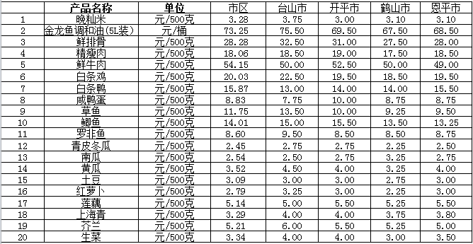 說明:1、表中價(jià)格為該地區(qū)監(jiān)測點(diǎn)綜合平均價(jià);2、“市區(qū)”含蓬江區(qū)、江海區(qū)、新會區(qū),價(jià)格分別采自蓬江市場、江南市場、城東市場等13家農(nóng)貿(mào)市場;3、其他四個(gè)縣市價(jià)格分別采自新華市場、錦江市場等8家農(nóng)貿(mào)市場。