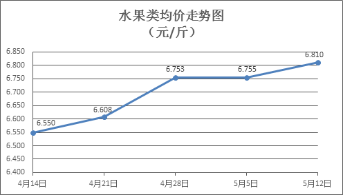 水果類商品價格略有上漲。所監(jiān)測的6種水果商品價格波動情況為4漲1跌1平,綜合零售均價為每斤6.810元,環(huán)比上漲0.81%。其中橙子、蘋果、葡萄零售均價分別為每斤5.69元、7.45元、15.23元,環(huán)比分別上漲2.52%、上漲0.81%、下降0.26%。