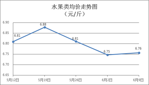水果類商品價格升降互現。所監(jiān)測的6種水果商品價格波動情況為3漲3跌,綜合零售均價為每斤6.76元,環(huán)比上漲0.15%。其中橙子、香蕉、葡萄零售均價分別為每斤5.69元、2.95元、14.90元,環(huán)比分別上漲0.35%、上漲3.15%、下降0.20%。
