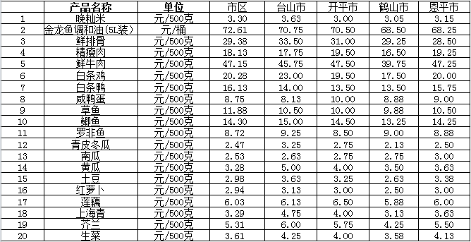說明:1、表中價格為該地區(qū)監(jiān)測點綜合平均價;2、“市區(qū)”含蓬江區(qū)、江海區(qū)、新會區(qū),價格分別采自蓬江市場、江南市場、城東市場等13家農(nóng)貿(mào)市場;3、其他四個縣市價格分別采自新華市場、錦江市場等8家農(nóng)貿(mào)市場。