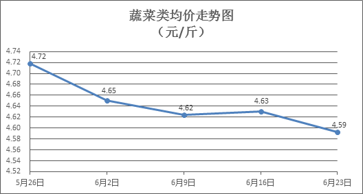 蔬菜類商品價格普遍下降。所監(jiān)測的32 種蔬菜商品價格波動情況為6漲22跌4平,綜合零售均價為每斤4.59元,環(huán)比下降0.80%。其中:漲幅居前的品種包括西洋菜、苦瓜、菠菜,零售均價分別為每斤4.90元、5.11元、5.66元,環(huán)比分別上漲9.87%、3.23%、1.98%;跌幅靠前的品種包括西紅柿、花菜、絲瓜,零售均價分別為每斤4.36元、4.67元、4.79元,環(huán)比分別下降4.60%、3.91%、3.61%。