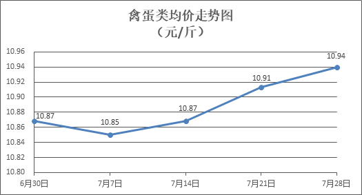 禽蛋類商品價(jià)格總體微漲。所監(jiān)測的6種禽蛋類商品價(jià)格波動情況為4漲1跌1平,綜合零售均價(jià)為每斤10.94元,環(huán)比上漲0.24%。其中:白條雞、白條鴨零售均價(jià)分別為每斤19.98元、15.12元,環(huán)比分別下降0.05%、上漲0.13%;白殼雞蛋、咸鴨蛋零售均價(jià)分別為每斤6.49元、9.00元,環(huán)比分別上漲0.15%、持平。