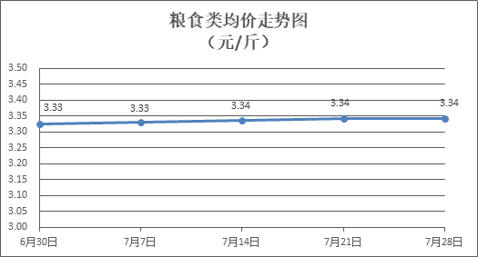 糧食類商品價(jià)格保持穩(wěn)定。所監(jiān)測的6種糧食類商品價(jià)格均持平,零售均價(jià)為每斤3.34元。其中:晚秈米、珍珠米、標(biāo)準(zhǔn)粉零售均價(jià)分別為每斤3.30元、3.11元、3.17元,環(huán)比均持平。