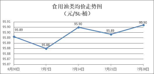 食用油類商品價(jià)格基本平穩(wěn)。所監(jiān)測的9種食用油(5L裝)商品價(jià)格波動情況為1漲1跌7平,綜合零售均價(jià)為每桶95.90元,環(huán)比上漲0.01%。其中:金龍魚花生油、菜籽油零售均價(jià)分別為每桶103.21元、73.07元,環(huán)比分別下降0.06%、上漲0.19%。