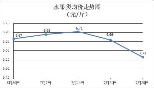 水果類商品價(jià)格小幅波動。所監(jiān)測的6種水果商品價(jià)格波動情況為3漲1跌2平,綜合零售均價(jià)為每斤6.57元,環(huán)比下降1.40%。其中橙子、蘋果、葡萄零售均價(jià)分別為每斤5.66元、7.53元、14.21元,環(huán)比分別持平、上漲0.80%、下降4.82%。