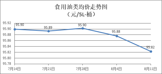 食用油類商品價(jià)格微幅下降。所監(jiān)測的9種食用油(5L裝)商品價(jià)格波動情況為2漲6跌1平,綜合零售均價(jià)為每桶95.82元,環(huán)比下降0.06%。其中:魯花花生油、金龍魚調(diào)和油零售均價(jià)分別為每桶154.40元、71.23元,環(huán)比分別下降0.05%、下降0.13%?! ?/p>