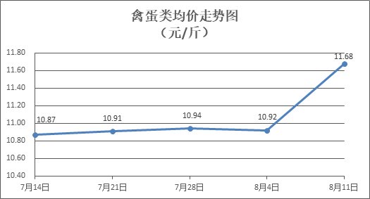禽蛋類商品價(jià)格略有上漲。所監(jiān)測的5種禽蛋類商品價(jià)格波動情況為3漲1跌1平,綜合零售均價(jià)為每斤11.68元,環(huán)比上漲0.29%。其中:白條雞、白條鴨零售均價(jià)分別為每斤20.01元、15.19元,環(huán)比分別上漲0.30%、上漲0.40%;白殼雞蛋、鴨蛋零售均價(jià)分別為每斤6.52元、7.67元,環(huán)比分別下降0.15%、上漲0.79%。