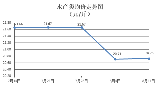 水產(chǎn)類商品價(jià)格窄幅盤整。所監(jiān)測的10種水產(chǎn)商品價(jià)格波動情況為4漲5跌1平,綜合均價(jià)為每斤20.73元,環(huán)比上漲0.10%。其中:草魚、鰱魚、鱸魚、羅非魚、基圍蝦零售均價(jià)分別為每斤11.21元、9.47元、21.49元、8.93元、29.58元,環(huán)比分別下降0.27%、上漲2.38%、下降0.69%、持平、下降0.37%?!?/p>