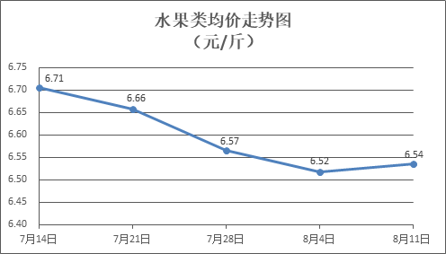 水果類商品價(jià)格以漲為主。所監(jiān)測的6種水果商品價(jià)格波動情況為5漲1跌,綜合零售均價(jià)為每斤6.54元,環(huán)比上漲0.28%。其中橙子、葡萄、梨零售均價(jià)分別為每斤5.72元、13.77元、5.81元,環(huán)比分別上漲1.24%、下降1.15%、上漲0.17%?!?/p>