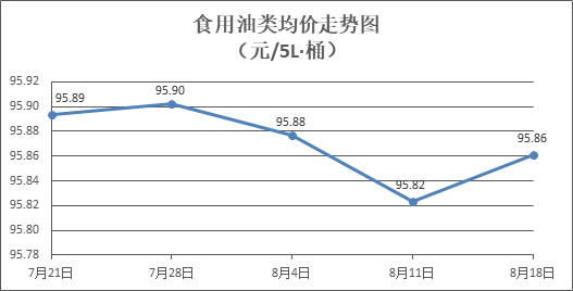 食用油類商品價格略有回升。所監(jiān)測的9種食用油(5L裝)商品價格波動情況為4漲2跌3平,綜合零售均價為每桶95.86元,環(huán)比上漲0.04%。其中:胡姬花花生油、玉米油零售均價分別為每桶144.75元、77.54元,環(huán)比分別上漲0.23%、上漲0.13%。
