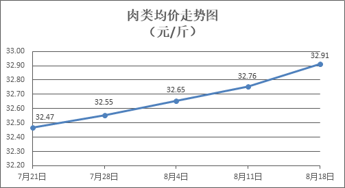 豬肉商品價格繼續(xù)走強。所監(jiān)測的8種肉類商品價格波動情況為5漲2跌1平,綜合零售均價為每斤32.91元,環(huán)比上漲0.48%。其中:排骨、精瘦肉、牛肉、帶骨羊肉零售均價分別為每斤32.60元、20.19元、45.41元、43.43元,環(huán)比分別上漲1.18%、上漲1.92%、下降0.02%、上漲0.18%。