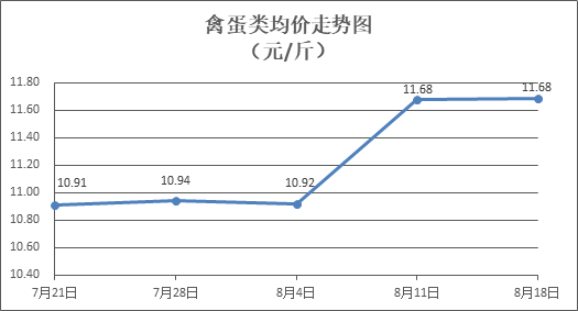 禽蛋類商品價格穩(wěn)中略漲。所監(jiān)測的5種禽蛋類商品價格波動情況為3漲1跌1平,綜合零售均價為每斤11.68元,環(huán)比上漲0.05%。其中:白條雞、白條鴨零售均價分別為每斤20.02元、15.23元,環(huán)比分別上漲0.05%、上漲0.26%;白殼雞蛋、鴨蛋零售均價分別為每斤6.49元、7.68元,環(huán)比分別下降0.46%、上漲0.13%。