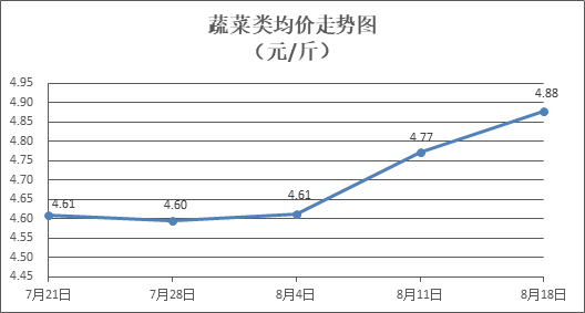 據(jù)本市21家農(nóng)貿(mào)市場監(jiān)測數(shù)據(jù)顯示,上周(8月12日至8月18日)市場上各類“菜籃子”商品供應充足,所監(jiān)測的7大類“菜籃子”商品價格周環(huán)比6漲1跌。其中:糧食類商品價格基本平穩(wěn),食用油價格略有回升,蔬菜、豬肉類商品價格維持強勢,禽蛋類、水產(chǎn)類、水果類商品價格窄幅盤整。受近期高溫和多雨天氣影響,上周葉菜類商品價格顯著走高。結(jié)合近期天氣及供應情況,預計至9月上旬,蔬菜類商品價格仍將維持季節(jié)性強勢。