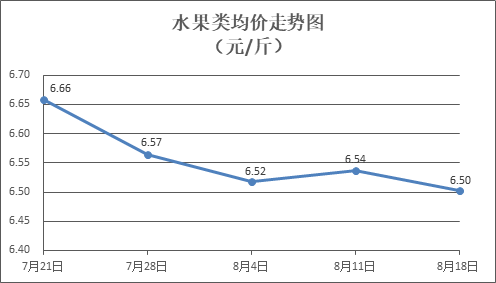 水果類商品價格漲跌互現(xiàn)。所監(jiān)測的6種水果商品價格波動情況為3漲3跌,綜合零售均價為每斤6.50元,環(huán)比下降0.51%。其中橙子、葡萄、西瓜零售均價分別為每斤5.80元、13.41元、3.23元,環(huán)比分別上漲1.40%、下降2.61%、上漲1.57%。