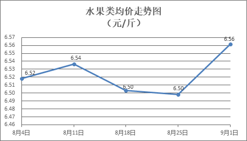 水果類商品價(jià)格小幅上漲。所監(jiān)測(cè)的6種水果商品價(jià)格波動(dòng)情況為4漲1跌1平,綜合零售均價(jià)為每斤6.56元,環(huán)比上漲0.97%。其中橙子、葡萄、西瓜零售均價(jià)分別為每斤5.95元、13.58元、3.25元,環(huán)比分別上漲2.06%、上漲1.57%、上漲0.93%。